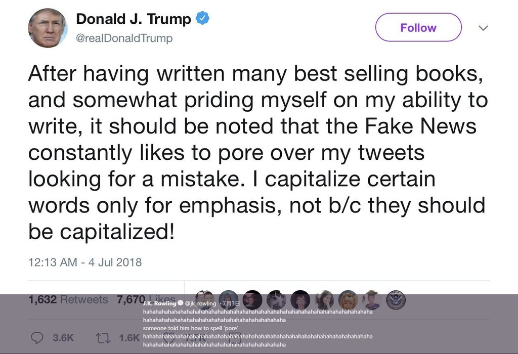 美國總統川普近日在一篇Twitter的發文中,讚揚自己的寫作能力,但文中的錯字卻被《哈利波特》作者J.K.羅琳抓包,誤將「pore over」拼成「pour over」。 J.K.羅琳隨後也在Twitter發文,整篇內容只打上「ha」來恥笑川普。韋伯字典的官方Twitter帳號則發文解釋,「pour over」指的是沖泡咖啡。