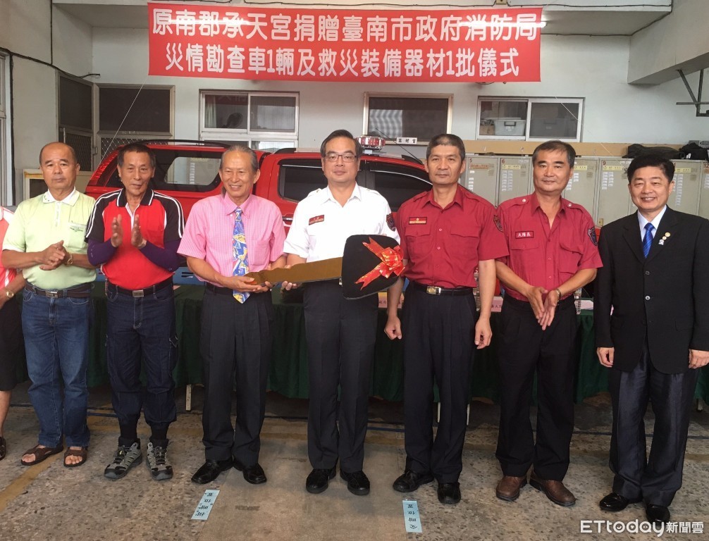 台南市消防局5日上午10時,於消防局第5救災救護大隊,舉行災情勘查車1輛及救災裝備器材1批受贈儀式,原南郡承天宮主委王敏星、副主委陳輝煌及總幹事陳文元、董事鄭川源、董事簡萬興、委員簡萬順等代表捐贈,台南市消防局副局長楊宗林代表接受並頒發感謝獎牌,感謝善行義舉。