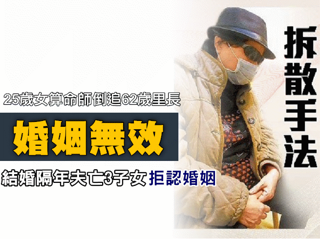 25歲的女算命師2014年7月因為算命結識當時擔任北市樟新里里長的陳文生,事後發現兩人命盤很合,是60年難得一見的有緣人,於是不顧37歲的年齡差展開追求,沒想到婚後隔年對方就過世了,3名子女也不認她這名「媽媽」。台北地院法官找來當時見證婚姻的2名證人,皆否認有參與見證,因此認定兩人婚姻無效。