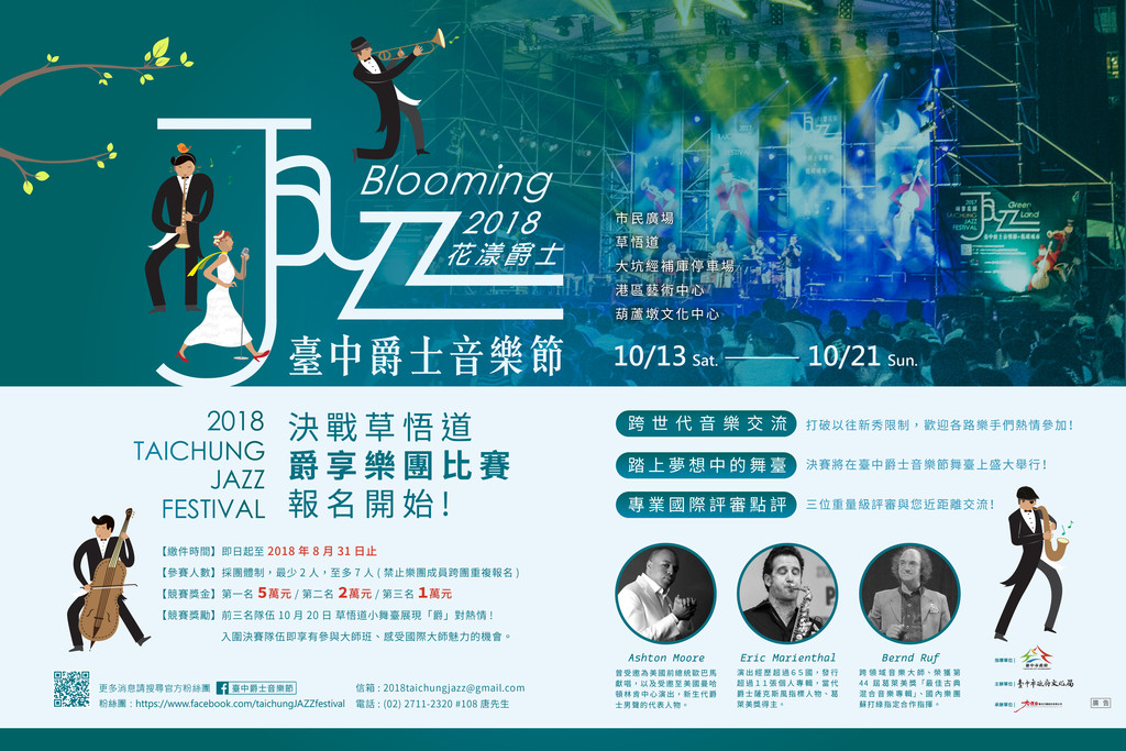 「2018臺中爵士音樂節」首場系列活動「爵士樂團比賽」,即日起至8月31日報名,不限國籍和年齡均可參加。為凸顯爵士樂的即興及與聽眾互動的特性,今年決賽時間選在爵士音樂節期間,並移師至草悟道舉行;評審陣容堅強,曾為美國前總統歐巴馬獻唱的Ashton Moore,及兩位葛萊美獎得主Eric Marienthal、Bernd Ruf,都受邀擔任。