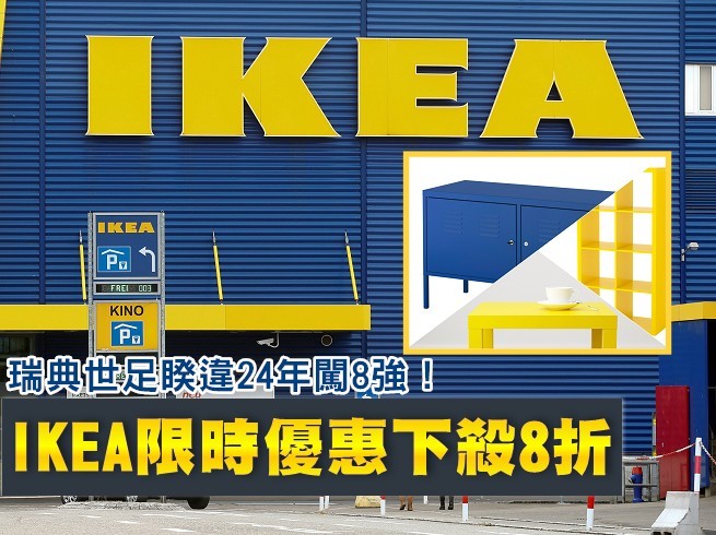 世足8強賽事今晚開踢,瑞典隊睽違24年闖進八強,被封為本屆的最大黑馬。而瑞典品牌IKEA也同步祭出限時優惠,自今天至9日期間,有瑞典國旗顏色的黃色與藍色指定商品全都下殺8折,希望用買氣來祝福瑞典隊能獲得更好的名次。