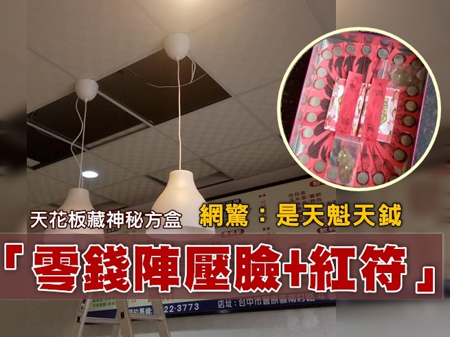 對於超自然的鬼神之說,多數人抱持著寧可信其有態度,尤其做生意的商家,多希望藉著特殊力量得到庇佑。就有裝修水電的師傅在某店家天花板發現奇異的餅乾盒,打開一看裡頭放著大量10元銅板,下方壓著小人臉,另放有紅色字符,讓他嚇得不知該如何是好!