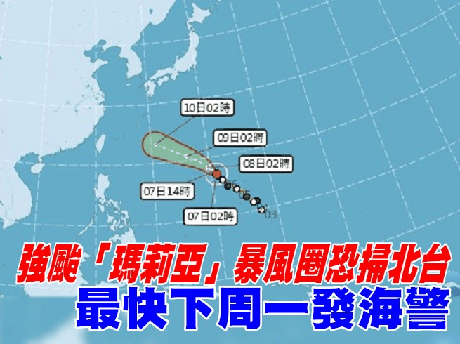 強颱「瑪莉亞」來勢洶洶,北台灣可能會被暴風圈掃到,最快將在下周一(9日)發布海上颱風警報。