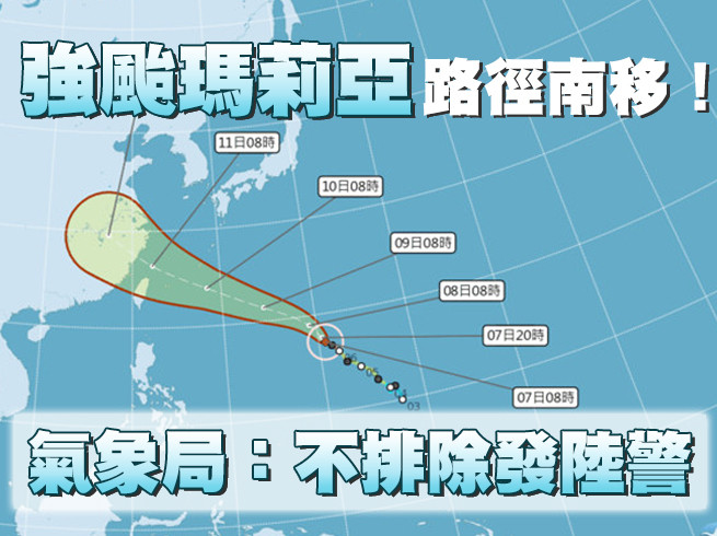 強颱「瑪莉亞」持續往台灣北部海面移動,氣象局今(7)日表示,最快將在下周一(9日)發布海上颱風警報,北部地區從10日晚上至11日整天會受到影響,且由於路徑偏南,也不排除有發布陸警的可能。