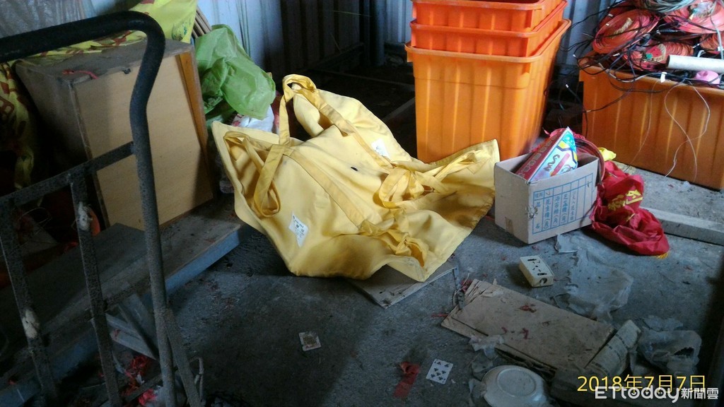 ▲台南市安南區青砂街二段,北汕尾城隍廟旁的倉庫發現一顆疑似軍用手榴彈,警方封鎖現場,並蓋上防爆毯,通報軍方查處中。(圖/記者林悅翻攝,下同)