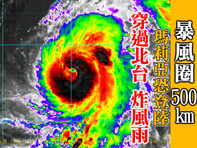 根據氣象局觀測,今年第8號颱風瑪莉亞7日晚間8時位於鵝鑾鼻東南東方2120公里海面上,加快腳步,以時速17公里速度向西北轉西北西,挾著「強颱」之姿朝台灣北部近海一帶移動,7級暴風半徑維持200公里,近中心最大風速每秒51公尺,相當於16級風。預計瑪莉亞在未來48小時內,會持續加速,且暴風圈恐擴大至超過500公里。