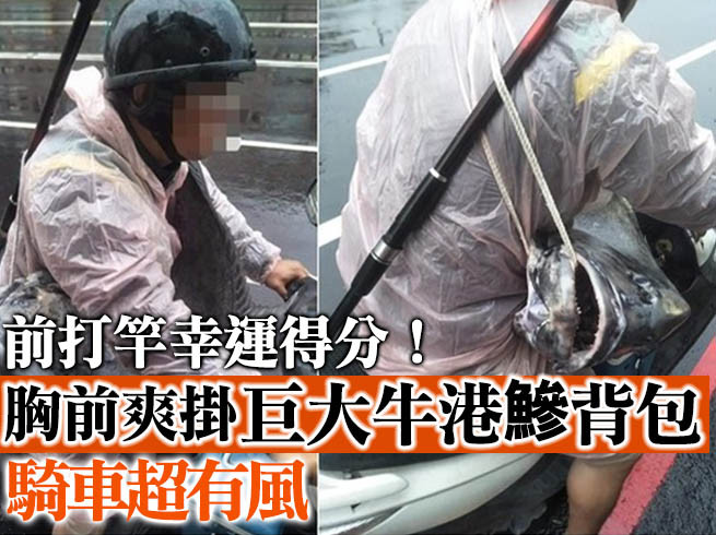 「今夏最新流行的斜背包!」畫面中,男子身穿雨衣,背上揹了根釣竿,胸前斜揹掛了一隻超巨大的牛港鰺,一路冒雨騎車險行;原PO還表示,這隻體型碩大的牛港鰺,是朋友在合法釣區以「前打」手法幸運釣起。
