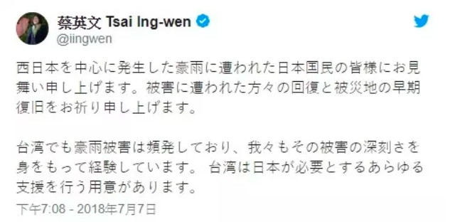 日本本州近日受梅雨鋒面影響,降下豪大雨,各地也傳出災情,連日本首相安倍晉三都坦言事態嚴重。對此,總統蔡英文7日則以「全日文」,透過社群媒體推特表示,台灣也時常受到豪雨侵襲,已經準備好提供日本的任何支援。