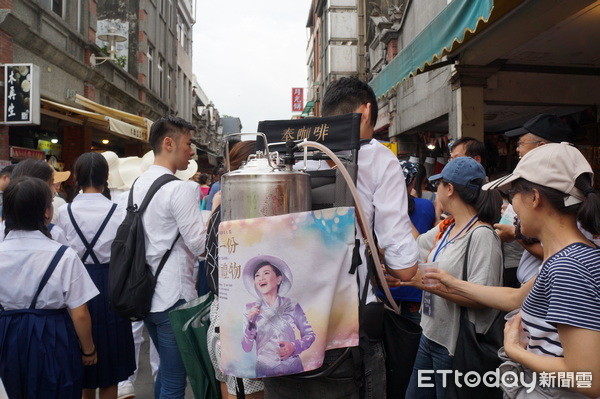 ▲鄭文燦親自發送活動DM給來逛老街的民眾,歡迎大家來參加紀念鳳飛飛的系列活動。▼熱情的「奉咖啡」也主動送上咖啡分享民眾。(圖/記者楊淑媛攝)