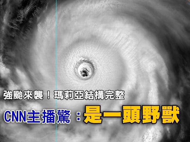 中央氣象局9日稍早發布強烈颱風瑪莉亞的「海上颱風警報」,預估最快深夜11時半發布陸上警報。其結構紮實,除了台灣民眾嚴陣以待,日本沖繩、南韓濟州島等地都將受到影響。各國媒體紛紛預測,瑪莉亞將「重重打擊」北台灣,就連美國有線電視新聞網(CNN)主播也忍不住驚呼,「這是一頭野獸!」