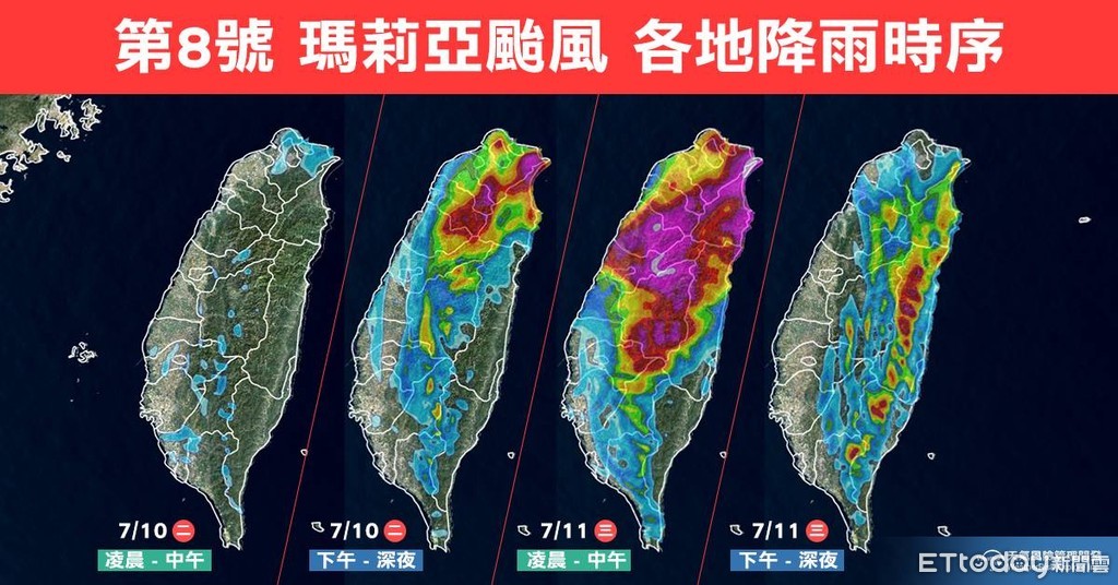 瑪莉亞颱風移動速度快,另外,天氣風險公司也預估,明(11日)上午開始北部風勢略緩,雨勢仍大,明(11日)下午起颱風將離開,登陸福建沿岸,除了台灣東半部之外,各地風雨將逐漸緩和。