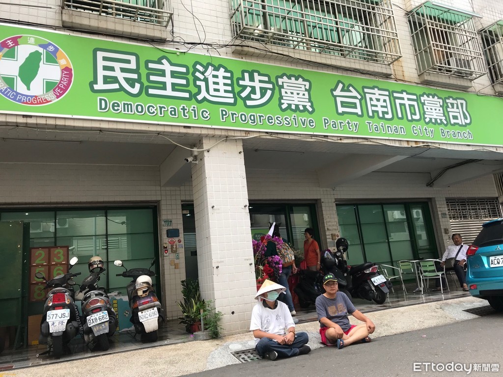 ▲民進黨台南市黨部前黨工吳宥成、陳世輝2人,因不滿遭市黨部非法解僱,前往市黨部前靜坐絕食抗議。(圖/記者林悅攝)