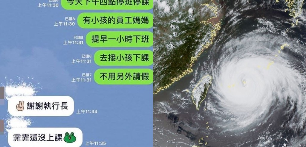 粉專「王宏哲教養、育兒寶典」今日下午貼出群組Line對話,執行長上午11時30分就告知有小孩的員工可提早一小時離開公司,也不用再另外請假,「又不是天天颱風,這點體諒不難,有心就能做到。」聽聞好消息,員工則是樂壞了,除了大力感謝執行長,也俏皮詢問「我們家的貓咪也算小孩嗎…我也要接他下課」、「有小孩但是沒上課,小孩怕颱風可以回家陪嗎?」可見內部感情十分融洽。