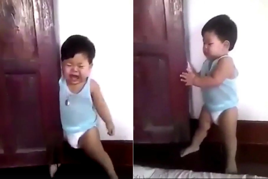 外國近期流傳一段影片,從畫面中可以看見,身穿背心吊嘎的小弟弟演技被媽媽拆穿後,立刻假裝沒有這一回事,把腿卡進木門與牆壁間的隙縫後,再挪動屁屁「一個move」完美卡位,接著皺臉嘶吼大哭,不時瞄母親是否再度狠心拆穿。