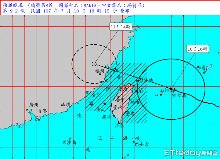▲強颱瑪莉亞預計傍晚觸陸,今(10)晚至明(11)清晨影響最劇烈。(圖/氣象局)
