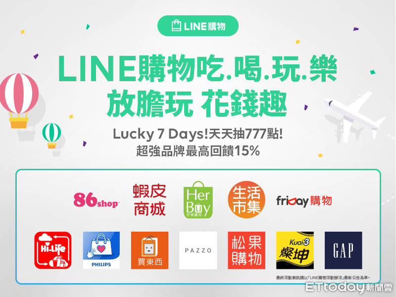 LINE 表示將會包括有機會以超低出價買到夢幻逸品的「Lucky Price」、聯合7大購物平台天天抽LINE Points 777點的「Lucky 7 Days」,以及聯合5家人氣品牌電商祭出最高LINE Points 15%回饋的「名店夏狂歡」。