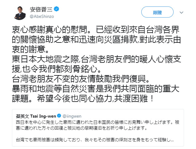 日本各地自5日起連日遭逢豪大雨,迄已造成逾百人傷亡,多處橋梁、房屋及道路損毀。為表達我政府及人民對日本災情的關懷,外交部9日指出,我政府決定捐贈2,000萬日圓(約新台幣600萬元)作為賑災之用。對此,日本首相安倍晉三10日特別以中文在推特表達感謝,並再次提到,台灣在東日本大地震(311)的支援,就令他們刻骨銘心。