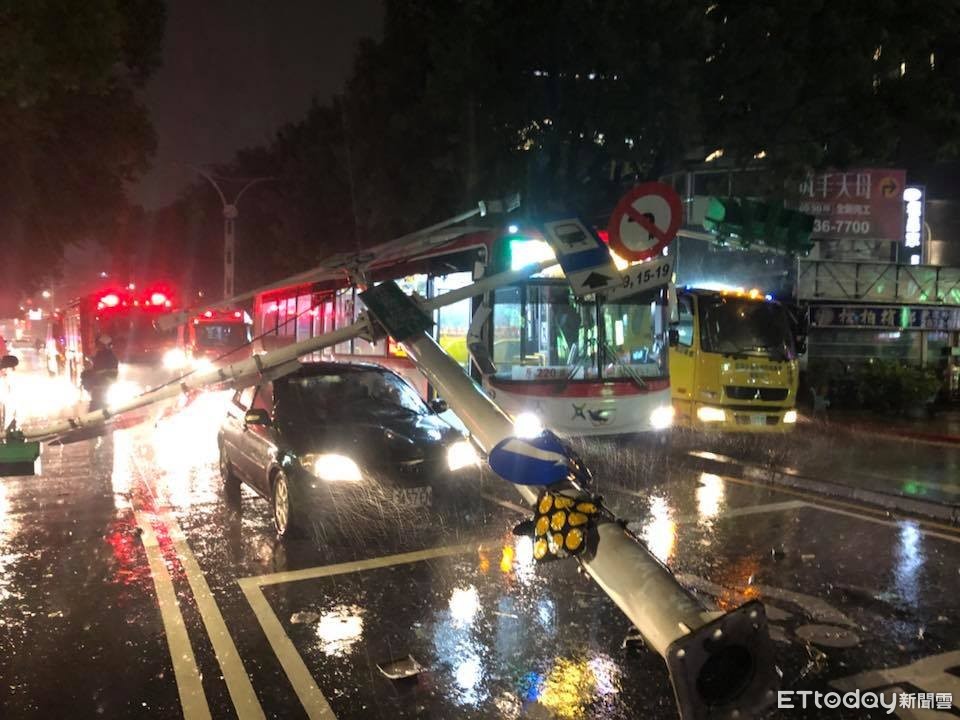 台北市中山北路六段10日晚間驚傳車禍事故,當時中興巴士一輛299路線公車疑因風雨太大打滑,轉彎撞上紅綠燈桿,導致燈桿砸落壓到小轎車、公車,現場有人受傷;根據北市災情通報,這是自瑪莉亞侵台以來北市第二起有人員受傷的災情,第一起是信義區有路人遭路樹砸傷。