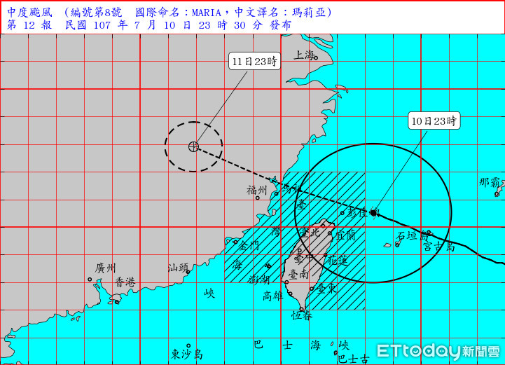 中央氣象局技正黃椿喜表示,瑪莉亞颱風10日晚間23點30分來到宜蘭的東北東方約 180 公里之海面上,以每小時31公里速度,向西北西進行。