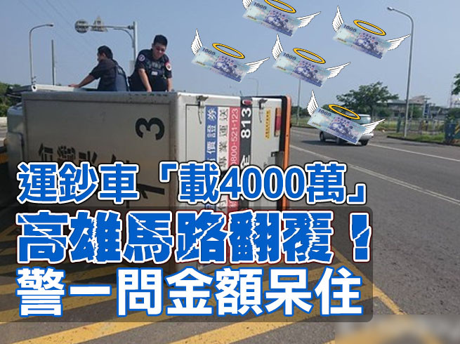 一輛載運4000萬現金的運鈔車10日下午行經高雄茄萣區時,疑因駕駛精神不濟,導致整輛車翻覆橫躺在馬路上。警方獲報到場後,見到2名保全人員全副武裝在旁戒備,發現是運鈔車翻覆,而且現場有大批現金,立刻派人支援戒護,直到保全公司另派車輛將現金運走,才鬆了一口氣。