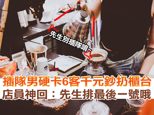 排隊等點餐最怕遇到沒禮貌的插隊奧客,一名餐飲業店員7日在臉書「靠北奧客」PO文指稱,有名男客寫完外帶菜單就把1000元丟在櫃台,完全無視後面6名正在排隊的顧客,好心提醒還反嗆「我趕時間」,他只好大聲回答,「因為你沒排隊,所以我們排在最後一號。」其他網友看完這句神回都大讚店員太霸氣,「謝謝你的堅持與隨機應變的能力!」