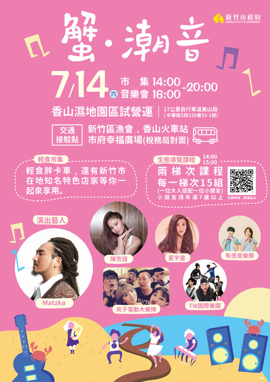 7月14日現場設置有輕食攤位,邀集新竹市知名在地美食業者,現場帶來特色美食,有香山纖碧爾啤酒、國際米粉、竹塹林記美食、紅豆村、御守茶、814大同冰店等。活動備有接駁車,歡迎大家多利用交通接駁車前往。