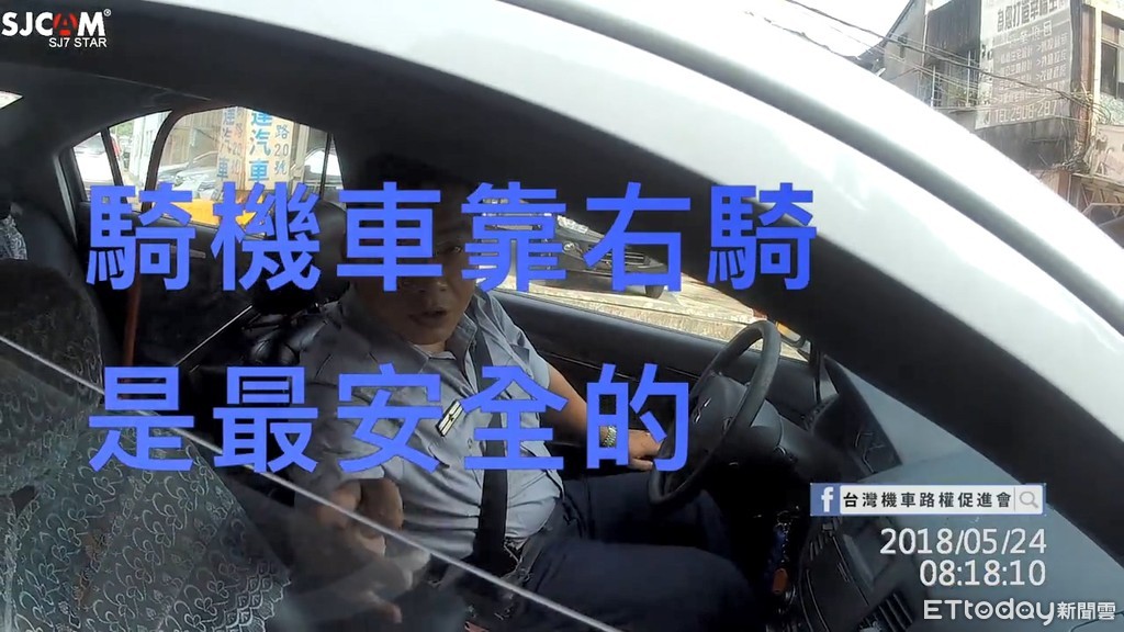 ▲新莊分局交通組童姓巡官連按喇叭,要騎士靠右騎比較安全。(圖/翻攝自台灣機車路權促進會)