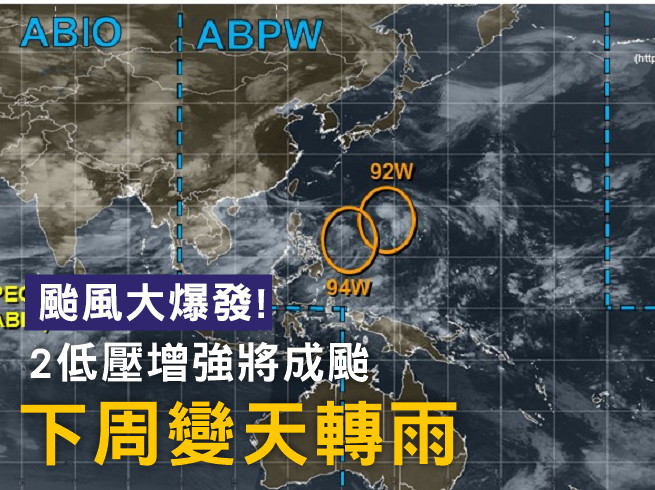 一周一颱成真!中央氣象局表示,菲律賓附近海面上可能有熱帶性低氣壓或颱風發展,但其位置、路徑及強度變化不確定性較高,台灣下周將處在一個大低壓帶環境內,尤其東半部、南部將變天轉雨。台灣唯一災害預報士賈新興也分析,未來2周出現颱風大爆發指標,「颱風溫床」季風槽目前有2個小傢伙,「看誰長得快」。