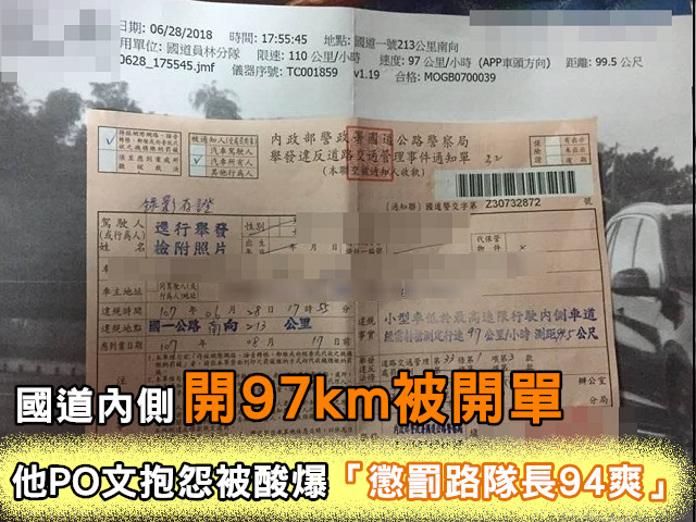 ▲國道內側開97km被開單,他PO文抱怨被酸爆「懲罰路隊長94爽」。(圖/翻攝自爆料公社)