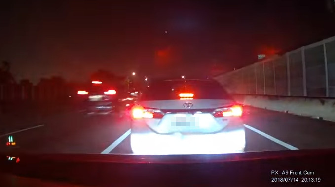 原PO在臉書不公開社團「爆料公社」貼出影片,表示當時下交流道塞車因此停車,沒想到他才剛說完「這裡很危險」就被撞了。從後方影片可以看到,原PO及時踩煞,紅色煞車燈亮超過4秒,但後方車輛完全沒有減速,一路直直撞上原PO車尾,發出「碰」一聲巨響,讓他當場崩潰直呼「三小…」。