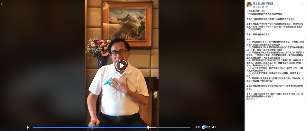 不過在今早陳水扁在「陳水扁新勇哥物語」發文:「阿扁為了不影響大會秩序與選舉造勢活動,特別向大會抱歉,改用『新勇哥物語』,並以4分53秒的影音談話善盡黨代表的建言責任。」
