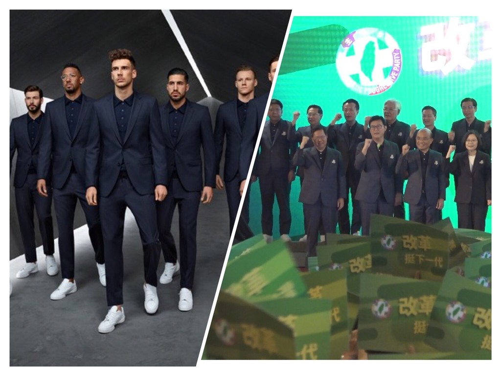▲民進黨全代會,縣市長參選人足球員登場,穿著比照德國男模隊。(合成圖/記者范綱儀、雨果博斯BOSS微博)