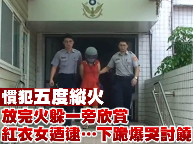 新北市新莊區民安西路14日深夜近11時驚傳火警,警消事後調閱監視器追查起火原因,赫然發現是一名紅衣女子惡意縱火;眼尖的警方還發現,該名女子就是縱火慣犯黃女(50歲),且在火勢熊熊燃燒時,黃女還返回現場「欣賞傑作」,當場就被警方逮個正著。眼見事跡敗露,黃女一開始還極力否認,甚至還聲淚俱下屈膝下跪求饒,但訊後仍遭警方依法送辦。
