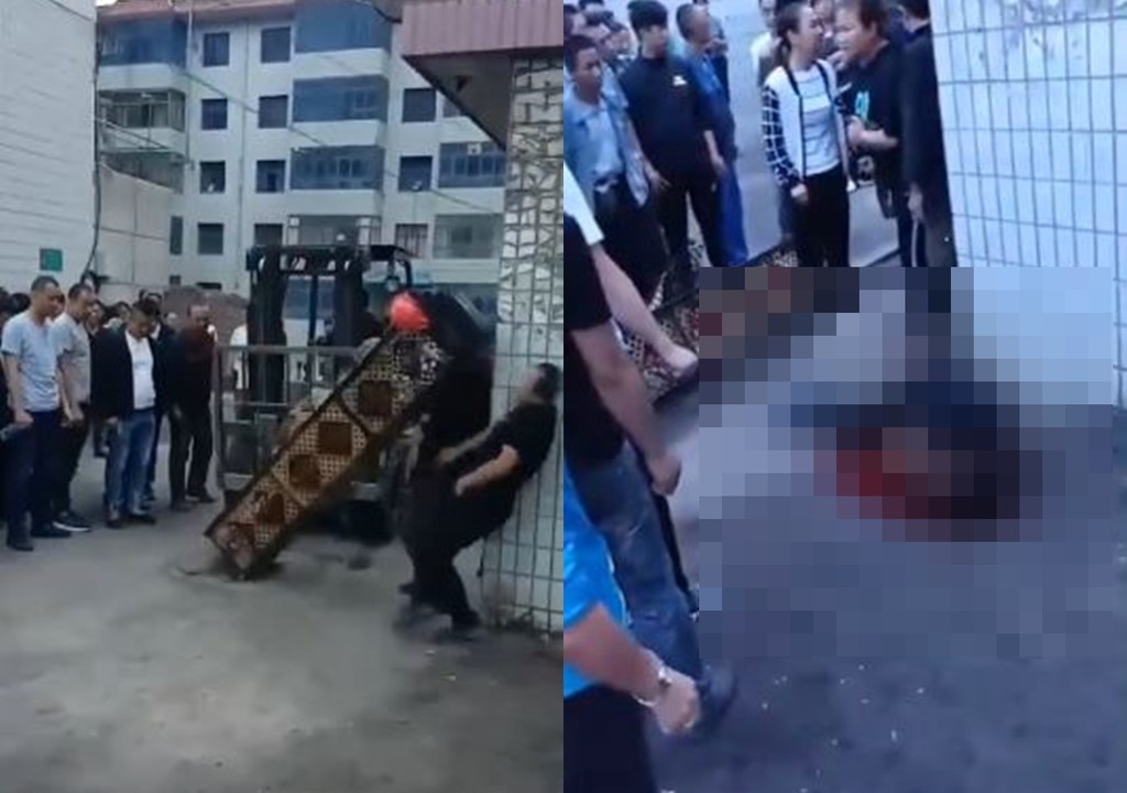 影片中可以看見,工人駕駛堆高機準備把一個鐵質柱子拔起,但是現場卻有非常多人在旁邊看熱鬧,而且幾乎所有人都沒有帶安全帽保護,當工人將堆高機升高把柱子拔起時,柱子卻突然朝一旁高速砸去,直接命中了一名圍觀男子的頭部,導致男子當場頭破血流,根據影片的網友回應,男子也已經不幸死亡。