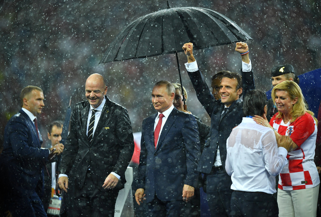2018俄羅斯世界盃冠軍戰15日登場,法國以4比2踢垮克羅埃西亞,睽違20年勇奪隊史第二冠。頒獎典禮上,一場傾盆大雨席捲球場。只見立刻有人上前幫俄國總統普丁撐傘,法國總理馬克宏(Emmanuel Macron)和克羅埃西亞的美女總統基塔羅維奇(Kolinda Grabar-Kitarovic)則被大雨淋的滿身濕。