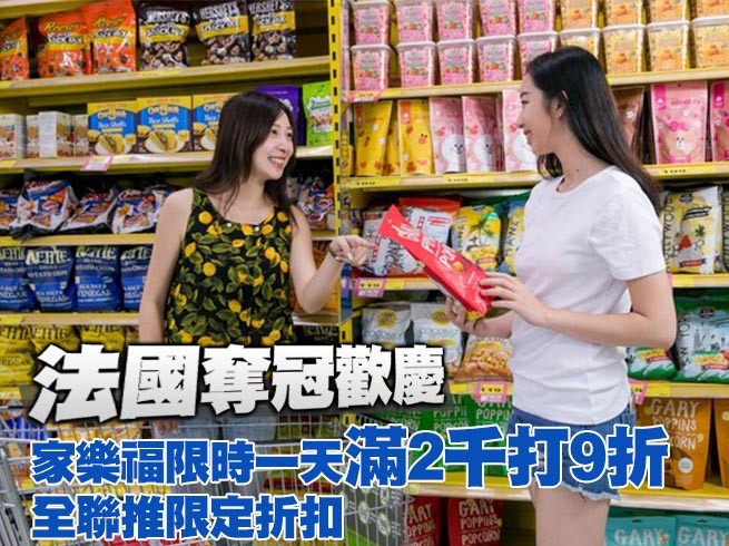 2018俄羅斯世界盃冠軍戰,法國4比2擊敗克羅埃西亞,睽違20年奪得隊史第二座冠軍。對於法國隊奪冠,除支持的球迷嗨翻外,法商家樂福也同歡慶,祭出限時一天全館單筆消費滿額打9折優惠活動。
