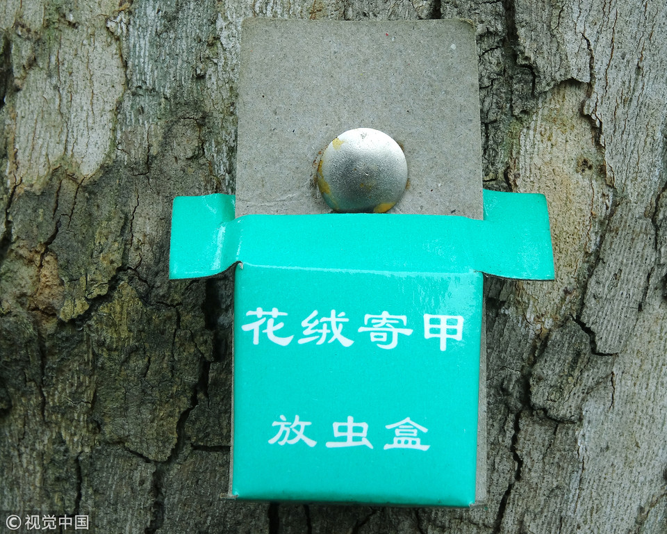 ▲圖為南京使用「以蟲治蟲」方式,放天牛天敵「花絨寄甲」蟲卵的綠色小紙盒,非文中北京照片。(示意圖/CFP)