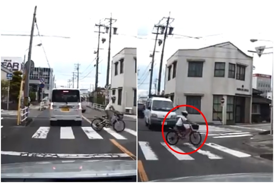 ▲日本駕駛一個「假動作」幫助騎單車的孩童過馬路。(圖/翻攝自tkuma_t_c推特影片,下同)