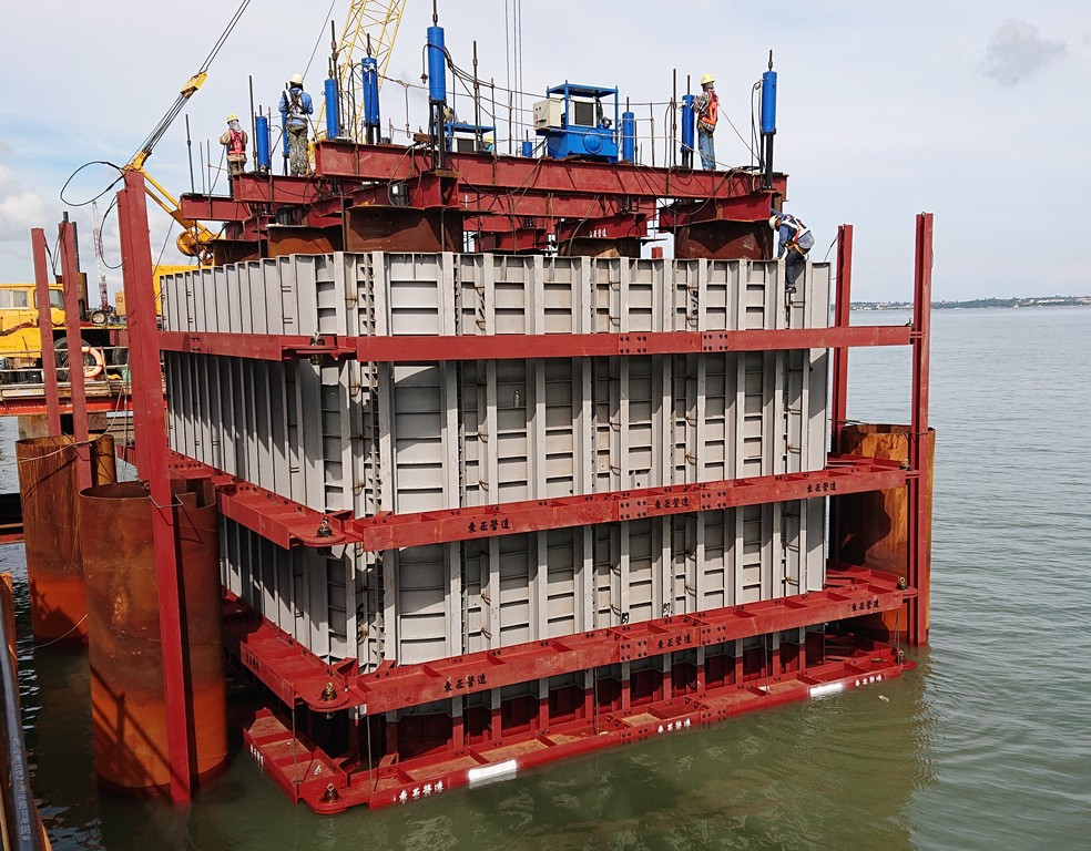 施工順序先利用海中基樁外套鋼管作為支撐,並將陸地組裝完成的鋼箱圍堰以24支鋼棒吊掛於基礎位置上方,接續利用12部千斤頂逐步沈降至海面下設計高度,再由潛水人員於海下3~9公尺安裝圍堰底版與基樁外套鋼管間封板,續於水中澆置封底混凝土(厚度1.5公尺)完成,再將鋼箱圍堰內部海水抽乾。
