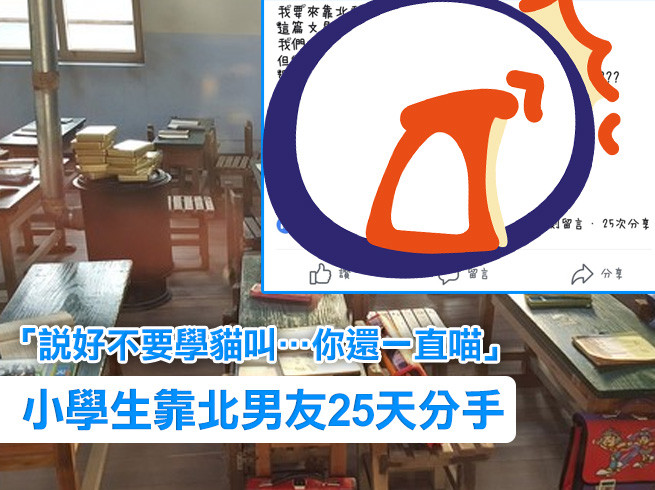 一名女網友在「靠北男友」po文,「我要來靠北我的男友,這篇文是我趁我爸媽不在的時候偷用電腦發的,我們明明說好,以後不能再學貓叫了,但你還是每天一直喵喵喵,還有你每次都跟4班的小瑄(珈瑄)走很近???所以我打算在這跟你分手,雖然我們發誓過說要一直走下去,也要一起生孩子跟結婚,但是我們終究得結束,我也很難過,25天快樂。」