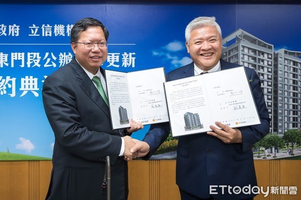 ▲桃園市長鄭文燦和立信機構總裁賴運興,於市府進行東門段公辦都更簽約。(圖/廖帝權提供)