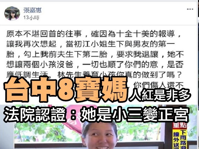 台中有個38歲的「超級媽媽」江孟芬育有2女5子,如今肚中又有新生命,媒體報導後,人人稱奇。不過,「人紅是非多」的真理從來沒有改變,江孟芬的老公的前妻「張嘉惠」16日上《爆料公社》指出,她和前夫生下一子後,前夫和江孟芬外遇產子,江孟芬以「不能讓小孩子沒爸爸」逼她退位,她的小孩憂鬱症死亡後,前夫拿走200萬的保險金,卻連小孩的塔位費都不出。