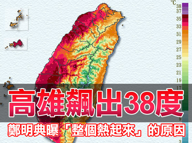 根據氣象局觀測資料顯示,高雄溪埔測站今中午12時飆上38度高溫,南投埔里、苗栗獅潭高溫也分別上看37.6度、36.9度,整個西半部被烤得紅通通的。氣象局副局長在臉書上解釋原因,主要是受到晴朗及弱風影響,氣象局中午也發布高溫訊息,提醒中午前後局部地區為高溫橙色或黃色燈號,有連續出現36度高溫的機率。