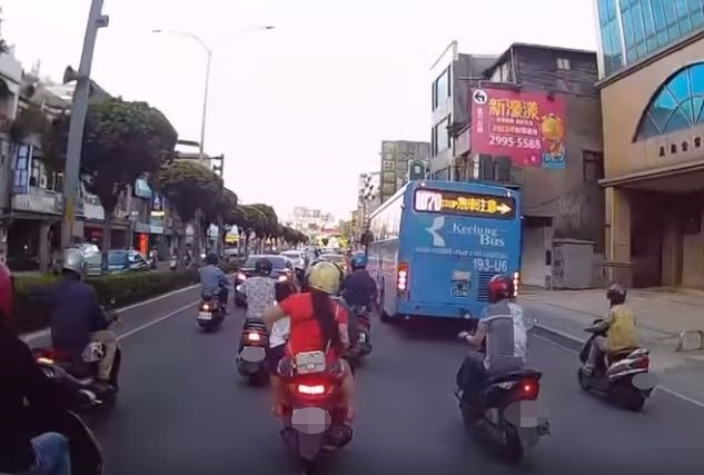影片中,只見三貼的騎士為了閃過公車,跟著其他用路人降慢速度並歪進內側車道,由於車速減慢讓畫面看起來更清晰,這才發現被後座女乘客單手環抱的女童姿勢十分危險,不僅半個身體都懸在左外側,還沒有戴安全帽,這時騎士為了鑽車縫還扭了一下閃過另外兩人。