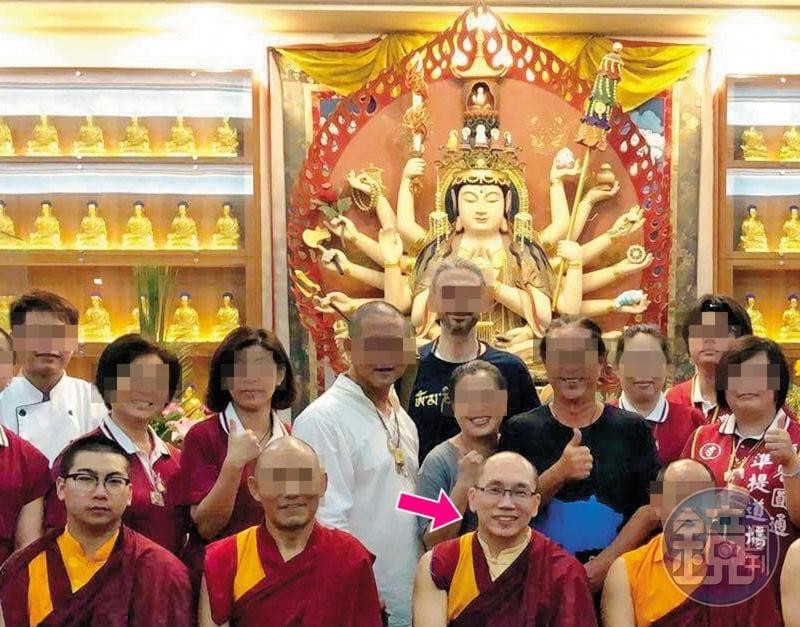 ▲曲吉囊覺上師(前右2,箭頭者)曾帶領門下弟子,浩浩蕩蕩前往演勝(前左)的道場參訪。(圖/鏡週刊)