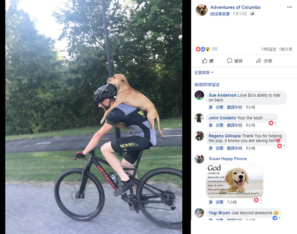 登山自行車手萊特(Jarrett Little)12日時,與車友一起到美國喬治亞州得哥倫布的樹林裡騎車,卻在途中遇見一隻遭遇車禍重傷的流浪狗,當下決定將狗狗背在自己的背上,帶回市區治療。幸運的是,狗狗在市中心遇到一位願意幫牠付治療費用的好人,還被取了一個很有意義的名字哥倫布(Columbo),現在健康快樂的生活在馬場裡。