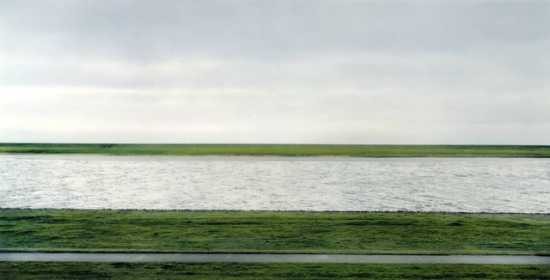 Gursky的作品『Rhine II』,畫面上是細長的小路、綠地、萊茵河與一段淺灰色的天空,這片平靜安逸的景色,卻是攝影師特別刪除掉人造碼頭與發電廠等人造機具後才能呈現,而這提醒我們,難道自然景色的真實樣貌,已經不存在了嗎?我們必須透過修圖才能見到自然的美景嗎?