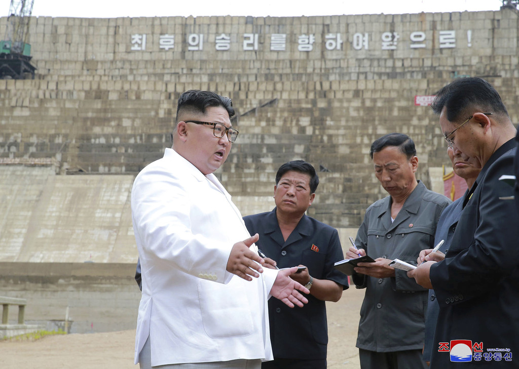 ▲金正恩巡視漁郎川水力發電廠的水壩工程時,當場飆罵負責官員。(圖/達志影像/美聯社)