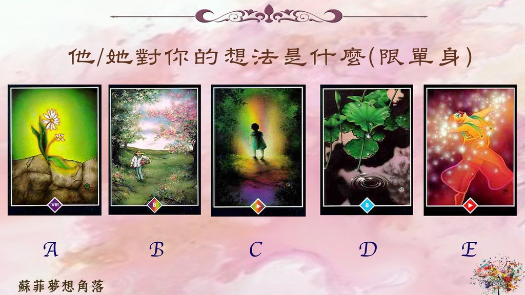 請放鬆心情,請依直覺在下圖中 (A)、(B)、(C)、(D)、(E)選擇一張牌卡,看看「他/她現在對我的想法是什麼呢?(限單身)」