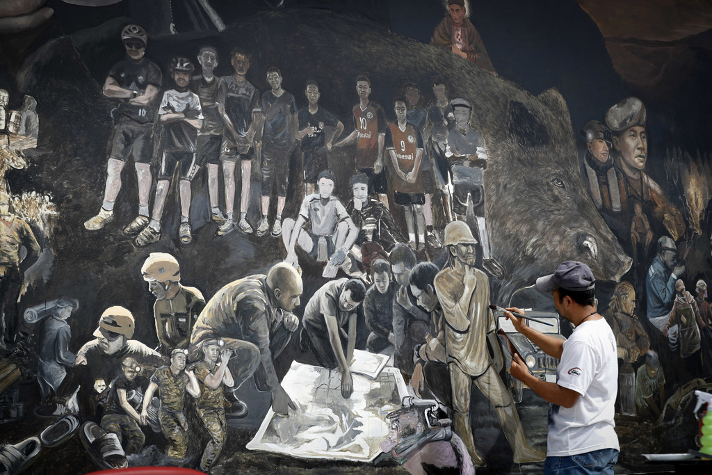 ▲清萊藝術家正在繪製洞穴搜救紀念畫作。(圖/達志影像/美聯社)